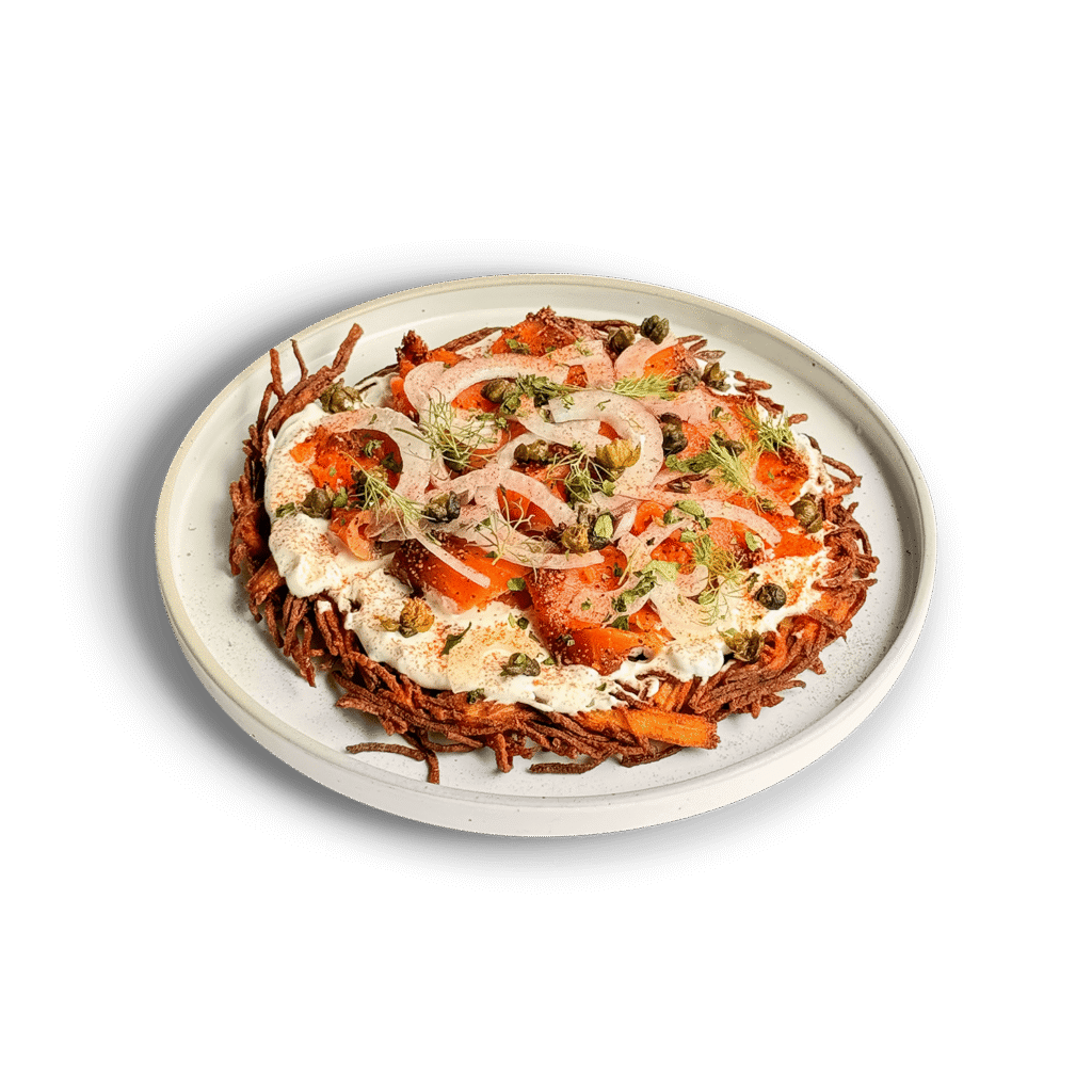 직접 훈제한 연어 파스트라미를 올려 바삭하게 구운 감자채전
